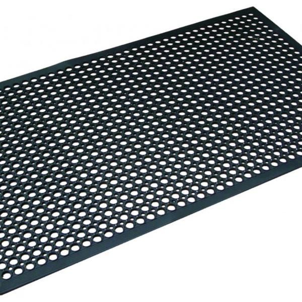 Safety Cushion Mat is a medium duty, 100% natural rubber, anti-slip, comfort Mat used medium use situations. The honeycombed patterned surface provides traction when the mat is being walked on, and the holes allow drainage.