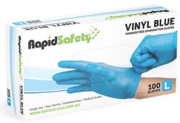 RapidSafety Blue Vinyl Powder Free Examination Gloves are medical grade and food grade, blue in colour for easy recognition in food handling. They are made from virgin PVC plastics and are 100% latex free.