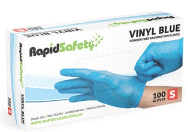 RapidSafety Blue Vinyl Powder Free Examination Gloves are medical grade and food grade, blue in colour for easy recognition in food handling. They are made from virgin PVC plastics and are 100% latex free.