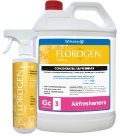 Florogen Citrus is a specially formulated, alcohol-based, surface and space deodorant. Florogen Citrus removes unwanted odours and has a pleasant citrus fragrance and kills 99.9% of bacteria.